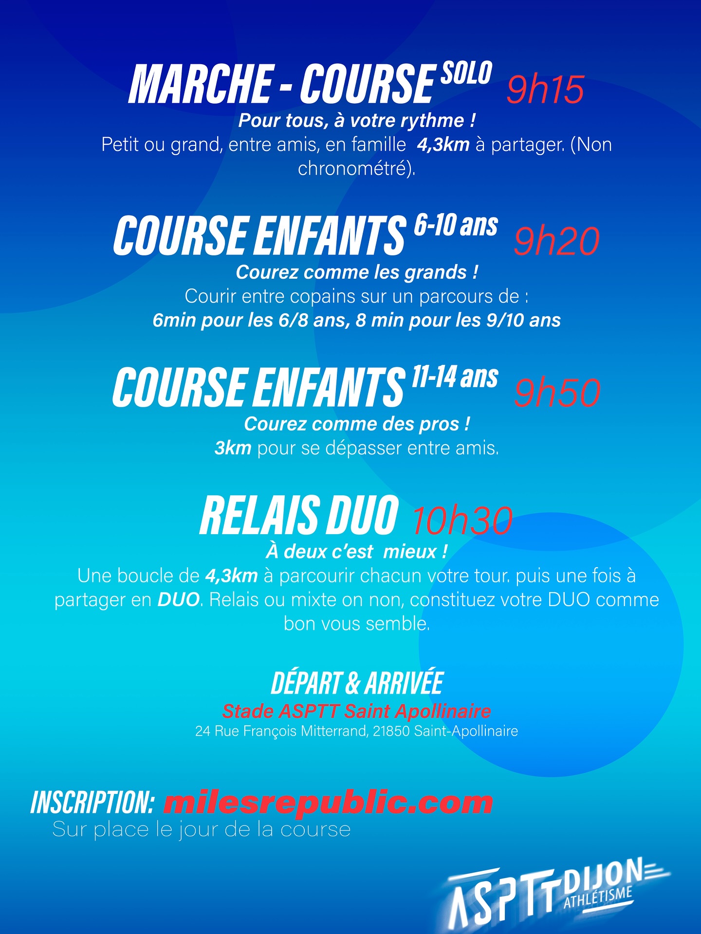 Les parcours empruntent les chemins blancs autour du complexe sportif de Saint-Apollinaire, avec un tracé accessible mais qui promet du rythme et du plaisir. Les enfants, eux, auront leur terrain de jeu adapté pour courir en toute sécurité et sentir l’adrénaline de la compétition dès le plus jeune âge (inscriptions sur place). Quant aux duos, vous vous lancerez chacun votre tour sur une boucle pour ensuite partager l’arrivée ensemble : parce qu’à deux, c’est toujours mieux.